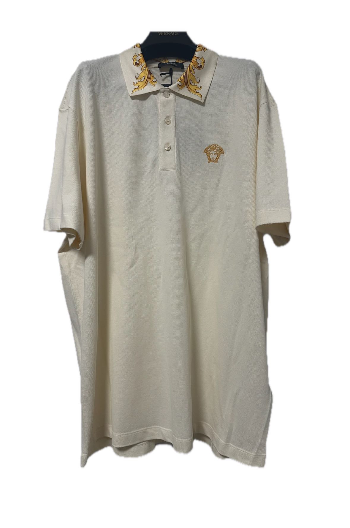 Versace Cream White Polo Shirt - Size 3XL - Contrast collar with Barocco Leaf prints - Embroidered Medusa logo - DS Conditions, never used with brand tag - Retail price 470€ - Measurements : lenght 80cm - shoulders 52cm - chest 58cm