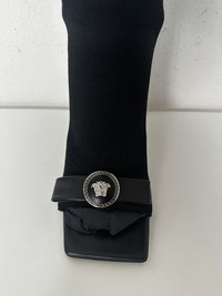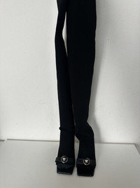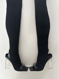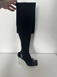 Versace Gianni Ribbon Open Thigh-High Boots - Color Black+Silver - Size 37 - These boots feature open toes and heels - They are set on light-weight transparent PVC block heels and are accented by archival 'nastro Gianni' bows with Medusa hardware. - Ove-the-knee with max lenght of 80cm - Heel height 10cm - Retail price 1.600€ - DS Conditions, never worn with dust bags #versace #versace2025 #versaceLuxury #boots #shoes #shoes2025 #luxury #fashion #black