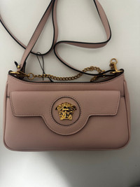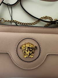 Versace La Medusa Mini Bag - Color Soft Pink - It is crafted from grainy calf leather with the gold Medusa hardware - The compact accessory can be worn crossbody or as an elegant clutch with the detachable chain shoulder strap - Top zip closure - Front flap pocket with magnetic closure - Interior slip pocket - Outer composition: 100% Calf leather - Lining: 100% Cotton - L 22 x D 4,5 X H 12,5 cm Strap: L 103 cm Extension of strap : 52 cm - DS Conditions, never used with brand tag - Retail price 990€ #versace #versace2025 #donatella #medusa #bag