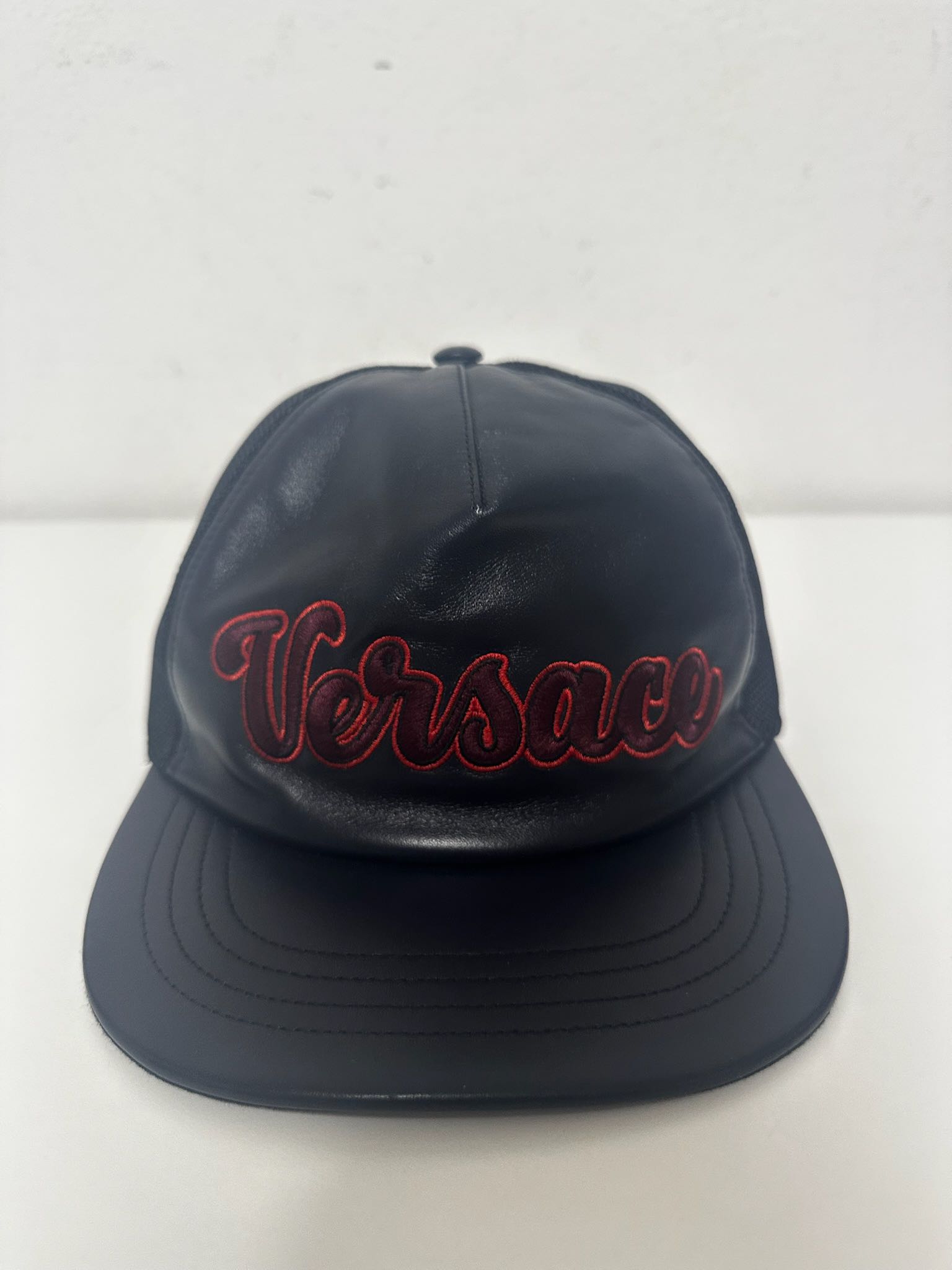 Versace Leather Logo Trucker Hat - Size 59 - Navy/Black - Embroidered red varsity logo lettering - Top button at crown, flat stitched brim, mesh back panel, adjustable strap at back - Retail price 550€ - DS Conditions, new with brand tag
