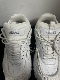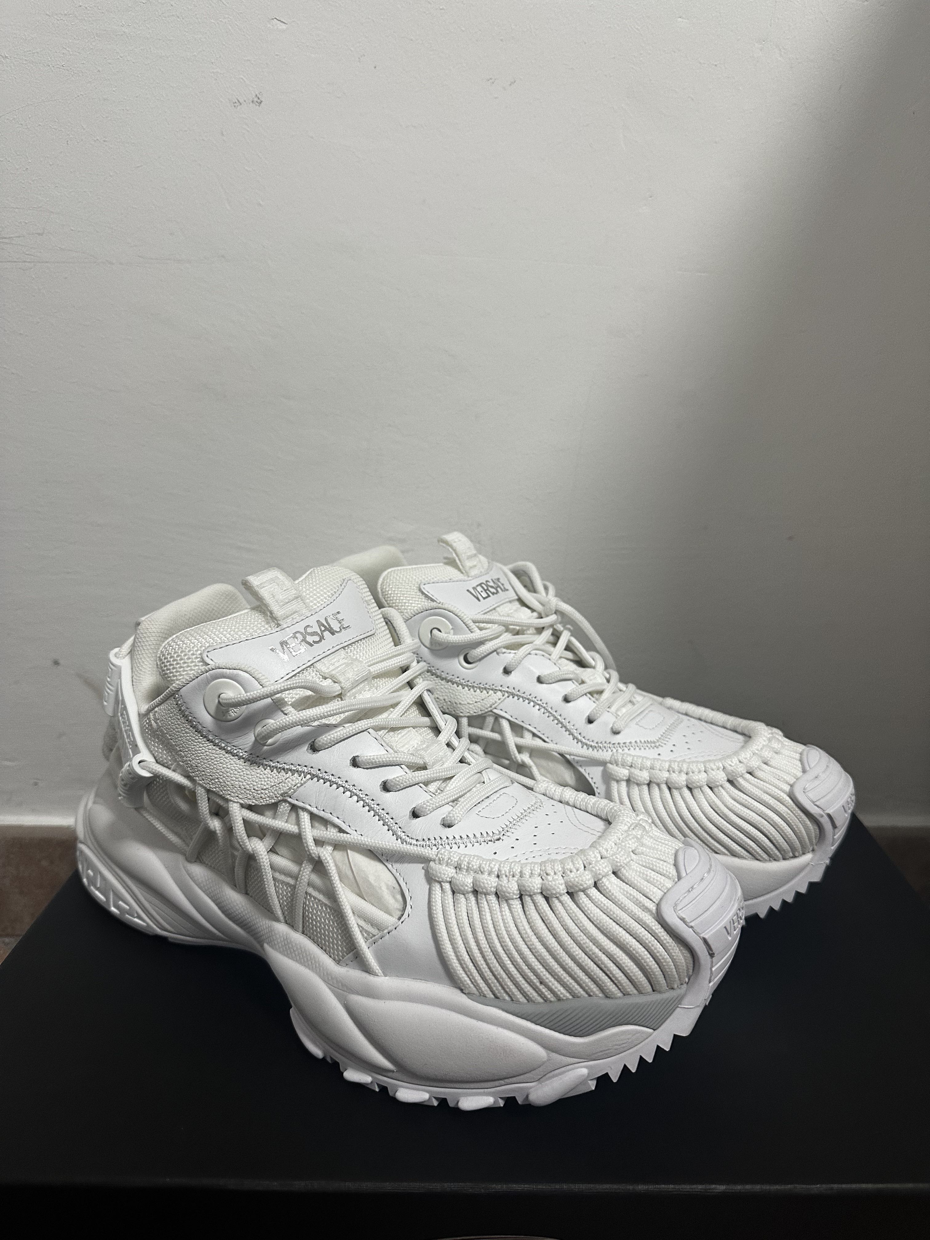 Versace Mercury M_VS_01 White Sneakers - Size 40 - Set on lightweight, shock-absorber Greca rubber and EVA soles - Cutout mesh and leather uppers are distinguished by a hand-knotted rope construction - Tongue is detailed by a foil Versace Logo and a jacquard Greca ribbon pull tab - Versace Logo engraved on side rubber loop - Outer composition: 100% Calf leather - Sole: 100% Rubber - DS Conditions, never used with packaging and dust bags - Retail price 890€ #versace #versace2025 #mercury #sneakers