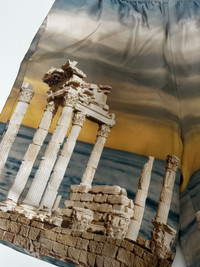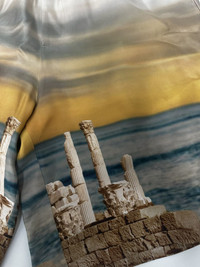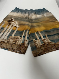 Versace Temple Silk Shorts - Size 48 - Fantasy print from ancient Greece, with temples and a sunset on the sea as background - Multicolor - No tag because it is a first test from the brand - 100% Silk - Measurements : lenght 53cm / waist 38cm / opening leg 33cm #temple #versace #versace2025 #versaceLuxury #shorts #silk #colorful #sample #fashion