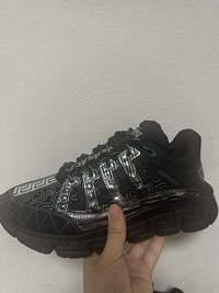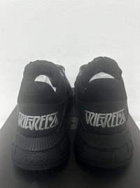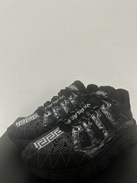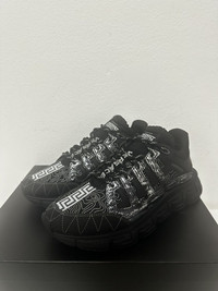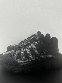 Versace Trigreca Sneakers - Size 42 - Black / Silver - Three-dimensional Greca executions on the soles offer an impactful landing with the "Greca Cushioning System." - In a subtle nod to Versace's home city, the uppers have a discrete print of Milan's coordinates. - Lace up, round toe - Trigreca print on tongue and heel counter - Outer and Insole fabric: 100% Polyester - DS conditions, new with their dust bag - Retail price is 790€ #versace #versace2025 #sneakers #trainers #chunky #3man #streetwear #luxury #black #sneakerstyle #trigreca