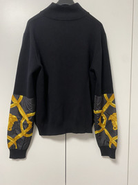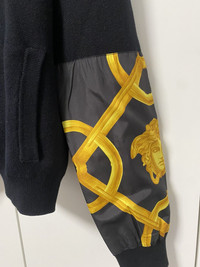 Versace Wool Sweatshirt - Size 50 - Wool knit, zip sweater - Barocco Medusa print design in nylon on the lower half of the sleeves - Gold hardware - Retail price 1580€ - DS Conditions, new with brand tag and certilogo - Measurements : lenght 66cm - chest 47cm - sleeves 61cm - shoulders 47cm #versace #versace2025 #knit #knitwear #sweatshirt #black #gold #winter