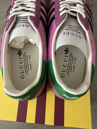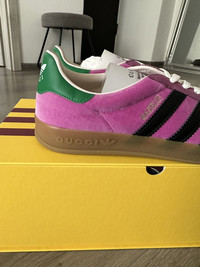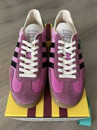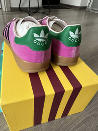 Introducing the Adidas x Gucci Gazelle 'Pink Velvet', a lavish reinterpretation of the classic Adidas silhouette through the luxurious lens of Gucci. This collaboration marries the sporty essence of the Gazelle with opulent details, featuring a plush pink velvet upper that exudes elegance and style. The iconic three stripes are reimagined in Gucci's signature webbing, creating a striking contrast that pays homage to both brands' heritage. Fits like a size US 8.5 | EU 41 1/3 Brand new, never worn, comes with all accessories Made in Italy RRP 1200+ and sold out worldwide I ship all my packages as gifted so you will not have to pay any custom fees