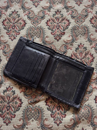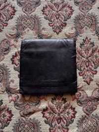 Helmut Lang Black Bison Leather Bifold Wallet Unused condition - reference piece only. Unique Helmut Lang accessory piece featuring clear ID slot and velcro closure. Multiple card slots and compartments. Very Rare Made in Japan 00s-licensed product. Dimensions: Closed: 5" x 4.5" Open: 9.5" x 5"