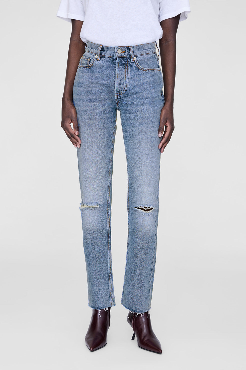 The Bruno Jean features a slim silhouette constructed from midweight 100% regenerative cotton denim without stretch in an antique destructed blue wash. - Regenerative cotton - High rise - Button-fly closure - Slim, straight leg - Ankle-length inseam - Raw-edge hem - Five-pocket design FIT + MEASUREMENTS High-Rise Slim Straight: Take your true size. Model is wearing a size 25. Model Measurements: Height: 5'9", Bust: 30", Waist: 23", Hips: 34" Product Measurements (Size 27): Inseam: 30", Rise: 11.3", Waist: 29.5", Hip: 39", Leg Opening: 14.5" MATERIAL + CARE 100% Regenerative Cotton Machine wash separately Made in Turkiye