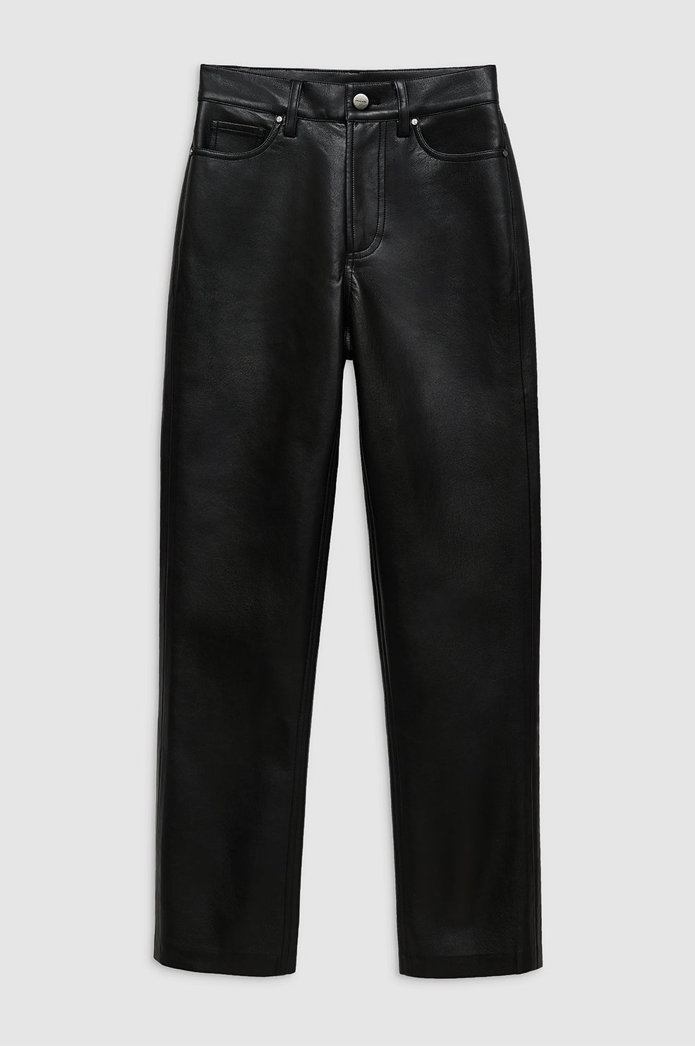 The Bruno Pant is constructed from soft yet structured regenerated leather with a slight sheen and without stretch. Its traditional denim-inspired silhouette features a 5-pocket design, zip-front closure, and a slim-straight leg with a clean, ankle-length hem. The Bruno Pant is cut for a high-rise, slim-straight fit with an ankle-length inseam. Take your true size. For a more relaxed fit, take one size up. FIT + MEASUREMENTS The Bruno Pant is cut for a high-rise, slim-straight fit with an ankle-length inseam. Take your true size. For a more relaxed fit, take one size up. Model is wearing a size 26. Model Measurements: Height 5′10", Bust 32", Waist 24", Hips 35" Product Measurements (Size 27): Inseam: 30", Rise: 10.5", Waist: 28.8", Hip: 37", Leg Opening: 14.5" MATERIAL + CARE 48% Leather, 25% Polyester, 27% Polyurethane Dry clean Made in China