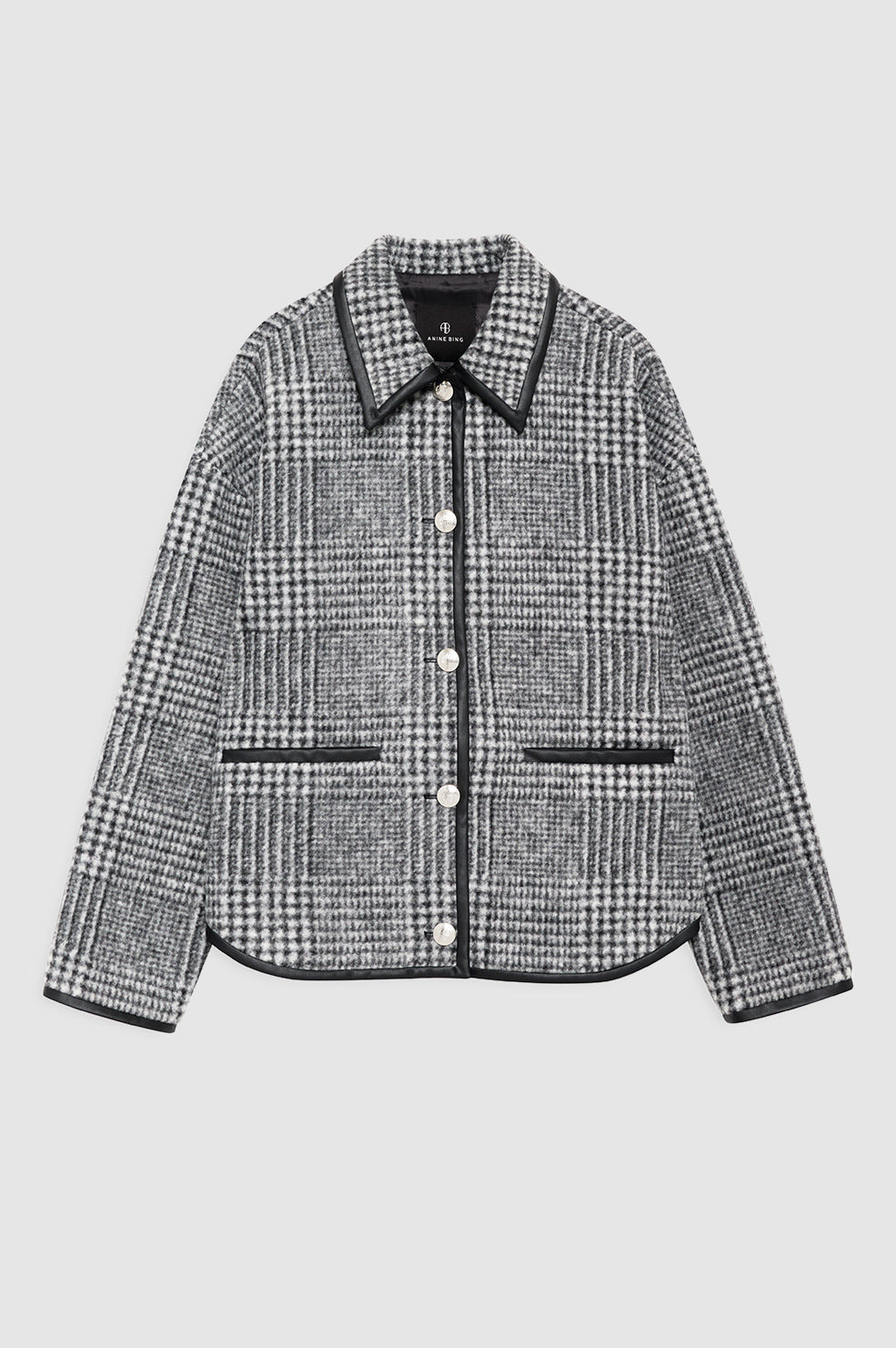A workwear-inspired jacket made from a wool blend featuring a black and grey check fleece pattern. - Wool blend - Fully lined - Cropped, boxy fit - Dropped armholes - Faux leather binding - Two slit pockets at the Hips: FIT + MEASUREMENTS Oversized Fit: Take your true size. Model is wearing a size S. Model Measurements: Height: 5'9.5", Bust: 32", Waist: 24.5", Hips: 33" Product Measurements (Size S): Length: 25", Bust: 47", Sleeve Length from Center Back: 33" MATERIAL + CARE 68% Polyester, 32% Wool Machine wash Made in Portugal