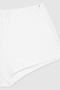 The Fran Boyshort is a seasonal intimate made from a delicate pointelle fabrication with a novelty trim. - Pointelle - Novelty trim - Relaxed fit - Cheeky coverage - Hand-tacked monogram charm FIT + MEASUREMENTS Relaxed Fit: Take your true size. Model is wearing a size S. Model Measurements: Height: 5'9", Bust: 30", Waist: 23", Hips: 34" Product Measurements (Size S): Inseam: 1.4", Rise: 8.6", Waist: 24", Hip: 33", Leg Opening: 21.5" MATERIAL + CARE 60% Polyester, 35% Rayon Machine wash Made in China