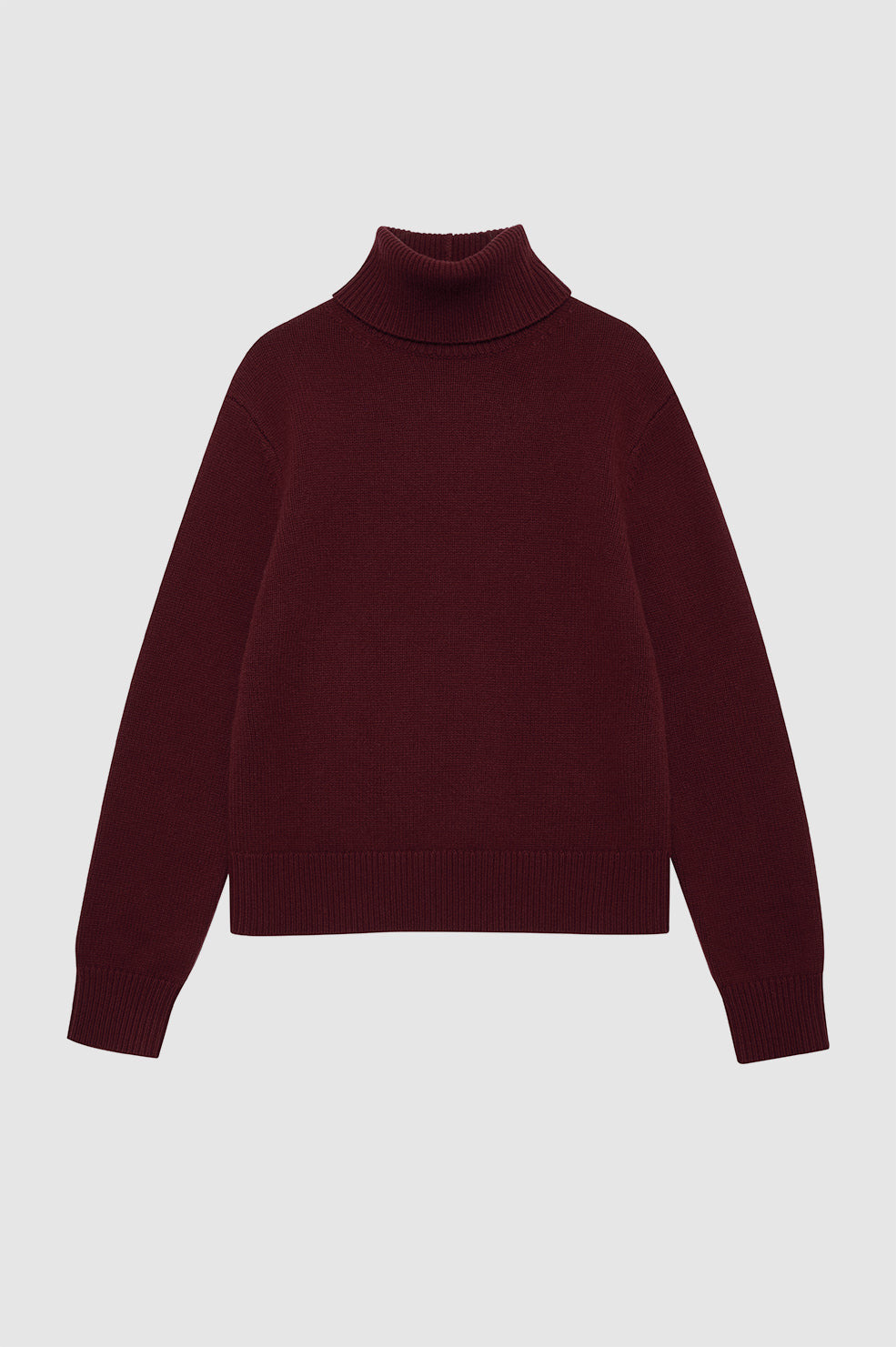 A timeless, everyday turtleneck featuring refined ribbing at the neck, cuffs, and hem in a deep cabernet. FIT + MEASUREMENTS Model is wearing a size S. Model Measurements: Height: 5'9", Bust: 30", Waist: 23", Hips: 34" Product Measurements (Size S): Length: 23", Bust: 19", Sleeve Length: 32.5" MATERIAL + CARE 90% Merino Wool 10% Cashmere Hand wash separately Made in China