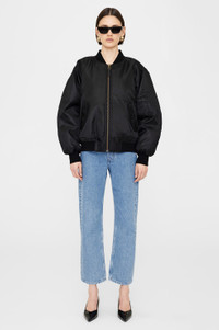 A traditional military-inspired bomber jacket made from a durable, slightly padded 100% polyester shell with a subtle sheen. Featuring traditional flight jacket details including tonal interior lining, two front flap pockets, a zipped sleeve pocket, and ribbed knit trim at the neck, cuffs, and waistband. Finished with a branded vegan-leather zipper pull down the center. The Leon Bomber is cut for a relaxed, oversized fit. For a true relaxed fit, take your true size. If a slightly smaller, more fitted silhouette is desired, we recommend taking one size down in this style. FIT + MEASUREMENTS The Leon Bomber is cut for a relaxed, oversized fit. For a true relaxed fit, take your true size. If a slightly smaller, more fitted silhouette is desired, we recommend taking one size down in this style. Model is wearing a size S. Model Measurements: Height: 5'10.5", Bust: 31", Waist: 24", Hips: 34" Product Measurements (Size S): Length: 24", Bust: 51", Sleeve Length from Center Back: 33.5" MATERIAL + CARE 100% Polyester Machine wash Made in China