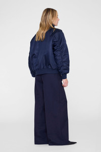 A traditional utilitarian-inspired bomber jacket made from a durable, slightly padded 100% polyester shell with a subtle sheen. - Polyester - Classic flight jacket details - Relaxed, oversized fit - Tonal interior lining - Two front flap pockets - Zipped sleeve pocket - Brass hardware - Ribbed knit trim at neck, cuffs, and waist FIT + MEASUREMENTS Relaxed, Oversized Fit: Take your true size. If a slightly smaller, more fitted silhouette is desired, we recommend taking one size down. Model is wearing a size S. Model Measurements: Height: 5'10", Bust: 30", Waist: 24, Hips: 33.5" Product Measurements (Size S): Length: 25", Bust: 51", Sleeve Length from Center Back: 33.5" MATERIAL + CARE 100% Polyester Dry clean Made in China