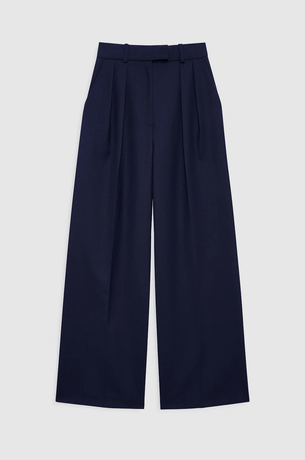 A full-length trouser made from a midweight blend suiting fabrication. - Wool blend - Fully lined - High rise - Extended tab and zip-front closure - Double pleat detailing - Dropped crotch - Ultra-wide leg - Full-length inseam - One back welt pocket FIT + MEASUREMENTS High-Rise, Ultra-Wide Leg, Full-Length Inseam: Take your true size. Model is wearing a size 2. Model Measurements: Height: 5'10", Bust: 30", Waist: 24, Hips: 33.5" Product Measurements (Size 36/6): Inseam: 32", Rise: 15.5", Waist: 28", Hip: 47", Leg Opening: 28.8" MATERIAL + CARE 52% Polyester, 48% Wool Machine wash Made in China
