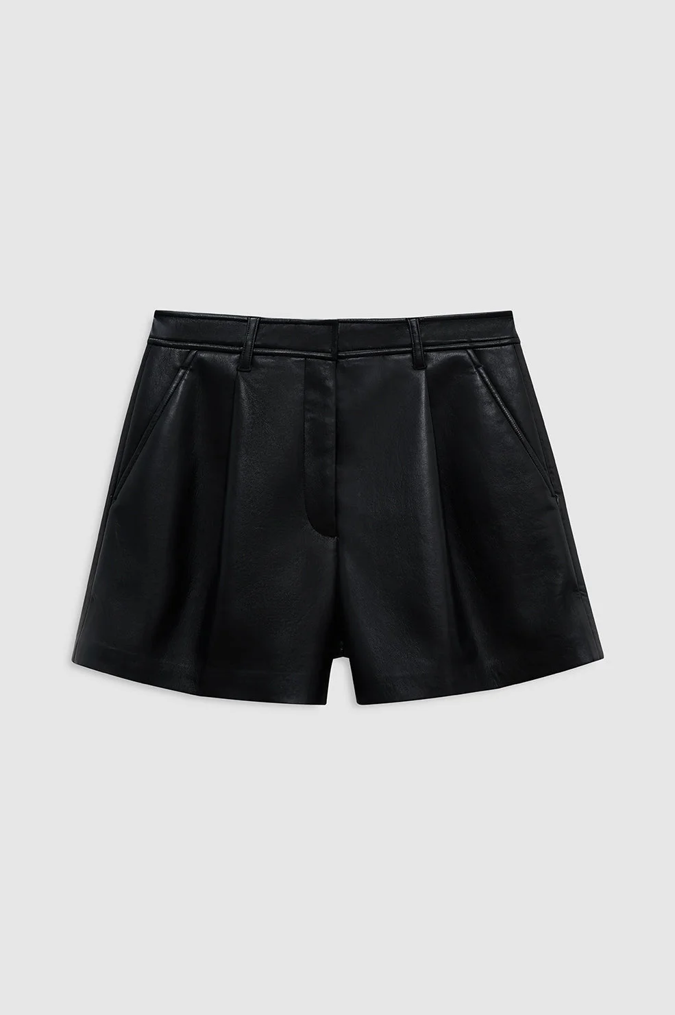 The Trent Short is a softly tailored bottom made from a midweight leather blend. - Leather blend - Fully lined - Relaxed fit - Low-to-mid rise - Front zip opening with a hook and bar closure - Functional belt loops - Pleat detailing - Front slanted pockets FIT + MEASUREMENTS Model is wearing a size 2. Model Measurements: Height: 5'9", Bust: 30", Waist: 23", Hips: 34" Product Measurements (Size 36/6): Inseam: 4.5", Rise: 11.8", Waist: 30", Hip: 40", Leg Opening: 27.5" MATERIAL + CARE 48% Leather, 25% Polyester, 27% Polyurethane Hand wash Made in China