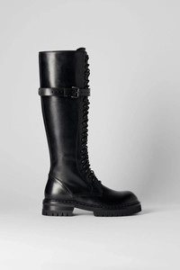 Men's black Alec high boots- Black- Black laces- Round toe- Buckle detail - Side zip closure- Tuxon leather- Heel: 3 cm- 100% Cow Leather- Made in Italy. Ann Demeulemeester shoes embody the essence of luxury and comfort. The generously wide fit is a design choice aimed at ensuring a comfortable wear. For those who prefer a snugger fit, we recommend using an insole. Crafted from the highest quality leather, it is natural for the shoes to feel stiff initially. By wearing and walking in them, they will perfectly mold to the shape of your feet, offering unparalleled comfort. The fit of this item is regular. Consider to purchase your usual size.