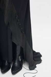 Dador Long Dress - Black - Satin-Effect Fabric – Draped Cowl Neckline – Thin Spaghetti Straps with Criss - Cross Back – Fitted Bodice – Asymmetric Leather Applique Panels with Raw Edges – Floor-Length Flared Skirt with Train – Low Open Back – Side Lace-Up Detail -73% Acrylic, 27% Viscose - Made in Italy Model wears italian size 40 The fit of this item is regular. Consider to purchase your usual size. Care To maintain the beauty and integrity of your purchase, we recommend treating it with care. Simple maintenance practices, such as gentle washing and proper storage, can effectively preserve the longevity of your favorites. We encourage you to refer to the care instructions included with each item, designed to help you keep your purchase in top condition. Design Our dedication to excellence extends beyond materials; it encompasses the artistry and craftsmanship illustrated in every piece we create.