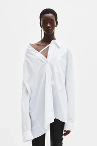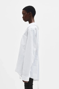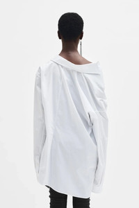 Daria Drop Shoulder Shirt - White - Cotton Poplin - Classic Collar - Off-The-Shoulder Neckline - Button Closure - Chest Pocket - Long Sleeves - Buttoned Cuffs - Asymmetric Hem - Draped - Loose Fit - 100% Cotton -Made in Italy Model wears italian size 40 The fit of this item is Oversize. Consider that half size is fitted and the other half is over. Care To maintain the beauty and integrity of your purchase, we recommend treating it with care. Simple maintenance practices, such as gentle washing and proper storage, can effectively preserve the longevity of your favorites. We encourage you to refer to the care instructions included with each item, designed to help you keep your purchase in top condition. Design Our dedication to excellence extends beyond materials; it encompasses the artistry and craftsmanship illustrated in every piece we create.