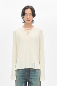 Deder Lace Up Serafino Sweater - White - Lace-up V-neck with tonal cord -Straight Hem With Subtle Distressing - 70% Wool, 30% Cashmere - Made in Italy Model wears italian size M Care To maintain the beauty and integrity of your purchase, we recommend treating it with care. Simple maintenance practices, such as gentle washing and proper storage, can effectively preserve the longevity of your favorites. We encourage you to refer to the care instructions included with each item, designed to help you keep your purchase in top condition. Design Our dedication to excellence extends beyond materials; it encompasses the artistry and craftsmanship illustrated in every piece we create.