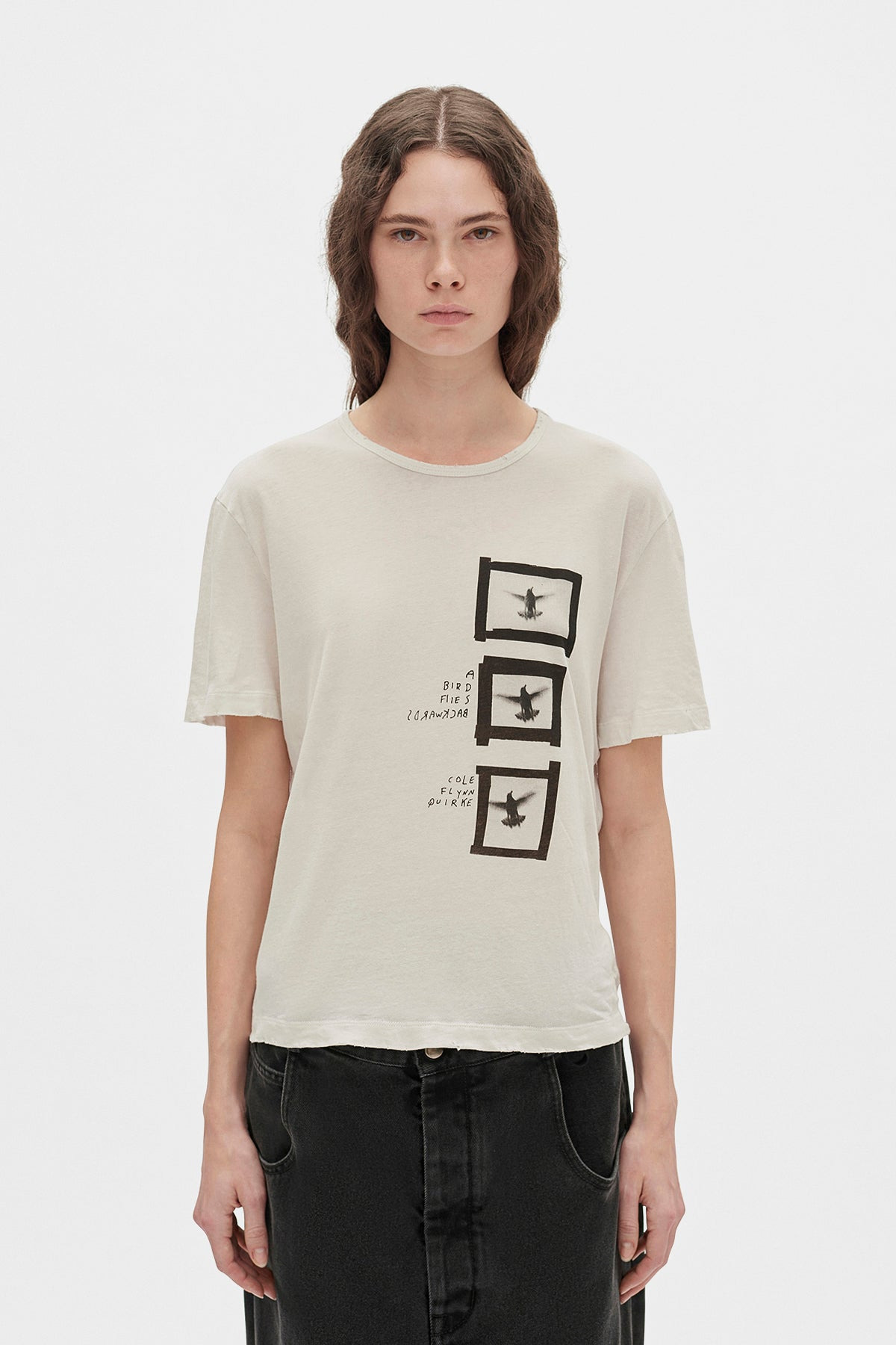 Fanie ''Doves'' Print T-shirt - Ivory - Vintage Cotton Jersey - Distressed Details - Round Neck - Front ''Doves'' Printed Patches - Dropped Shoulders - Short Sleeves - Regular Fit -100% Cotton - Made in Portugal Model wears size S The fit of this item is regular. Consider to purchase your usual size. Care To maintain the beauty and integrity of your purchase, we recommend treating it with care. Simple maintenance practices, such as gentle washing and proper storage, can effectively preserve the longevity of your favorites. We encourage you to refer to the care instructions included with each item, designed to help you keep your purchase in top condition. Design Our dedication to excellence extends beyond materials; it encompasses the artistry and craftsmanship illustrated in every piece we create.