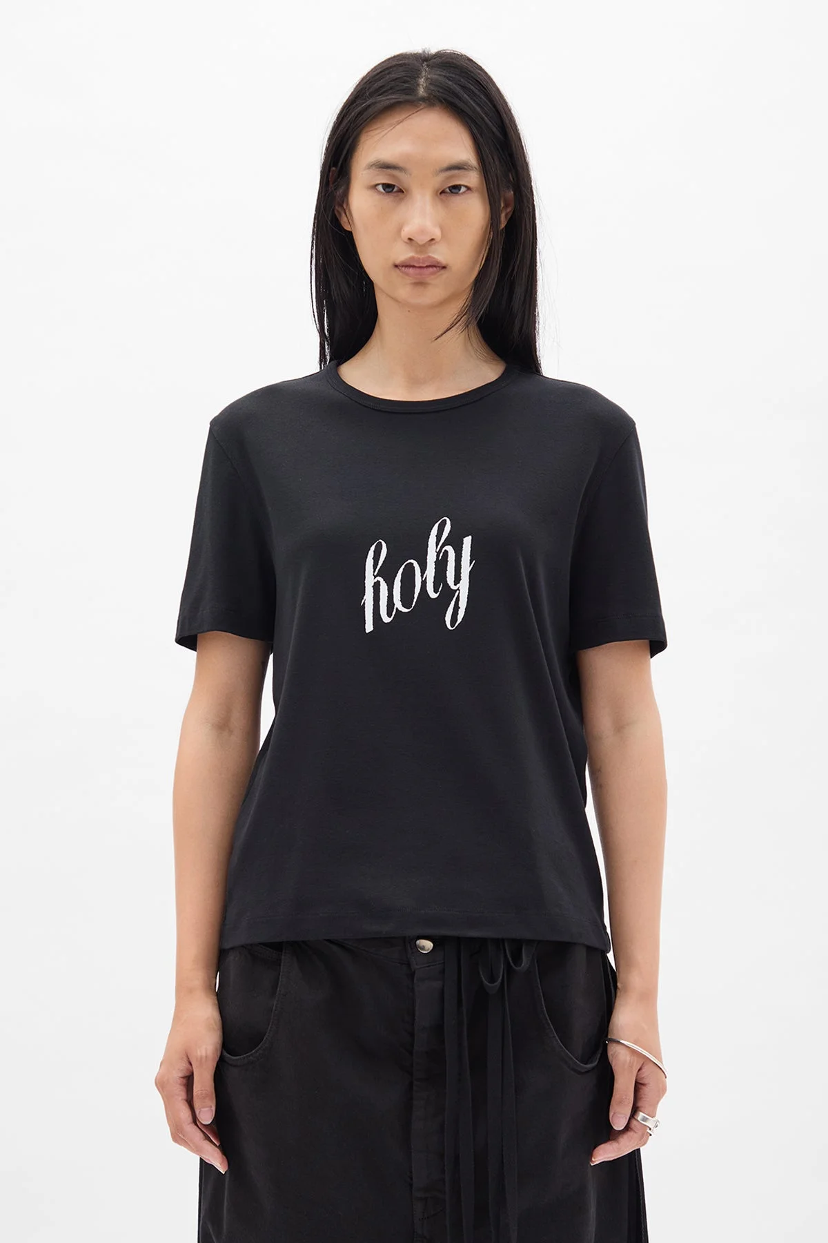 Fanie Standard Fit T-Shirt - Black - 100% Cotton - Crew Neck - Short Sleeve - "Holy" Graphic Print - Standard Fit - Made in Portugal Model wears italian size S Care To maintain the beauty and integrity of your purchase, we recommend treating it with care. Simple maintenance practices, such as gentle washing and proper storage, can effectively preserve the longevity of your favorites. We encourage you to refer to the care instructions included with each item, designed to help you keep your purchase in top condition. Design Our dedication to excellence extends beyond materials; it encompasses the artistry and craftsmanship illustrated in every piece we create.