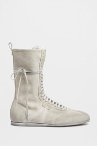 Fides High-Top Boxing Sneakers - Chalk - Worn-Effect - Back Pull Tab - Tongue With Logo Label - Wrap-Aroud Lace Closure - Side Zip Closure - Back Signature Rivet - Rubber Sole - 100% Cotton, 100% Calf Leather - Made in Italy The fit of this item is regular slim. Consider to purchase your usual size Care To maintain the beauty and integrity of your purchase, we recommend treating it with care. Simple maintenance practices, such as gentle washing and proper storage, can effectively preserve the longevity of your favorites. We encourage you to refer to the care instructions included with each item, designed to help you keep your purchase in top condition. Design Our dedication to excellence extends beyond materials; it encompasses the artistry and craftsmanship illustrated in every piece we create.