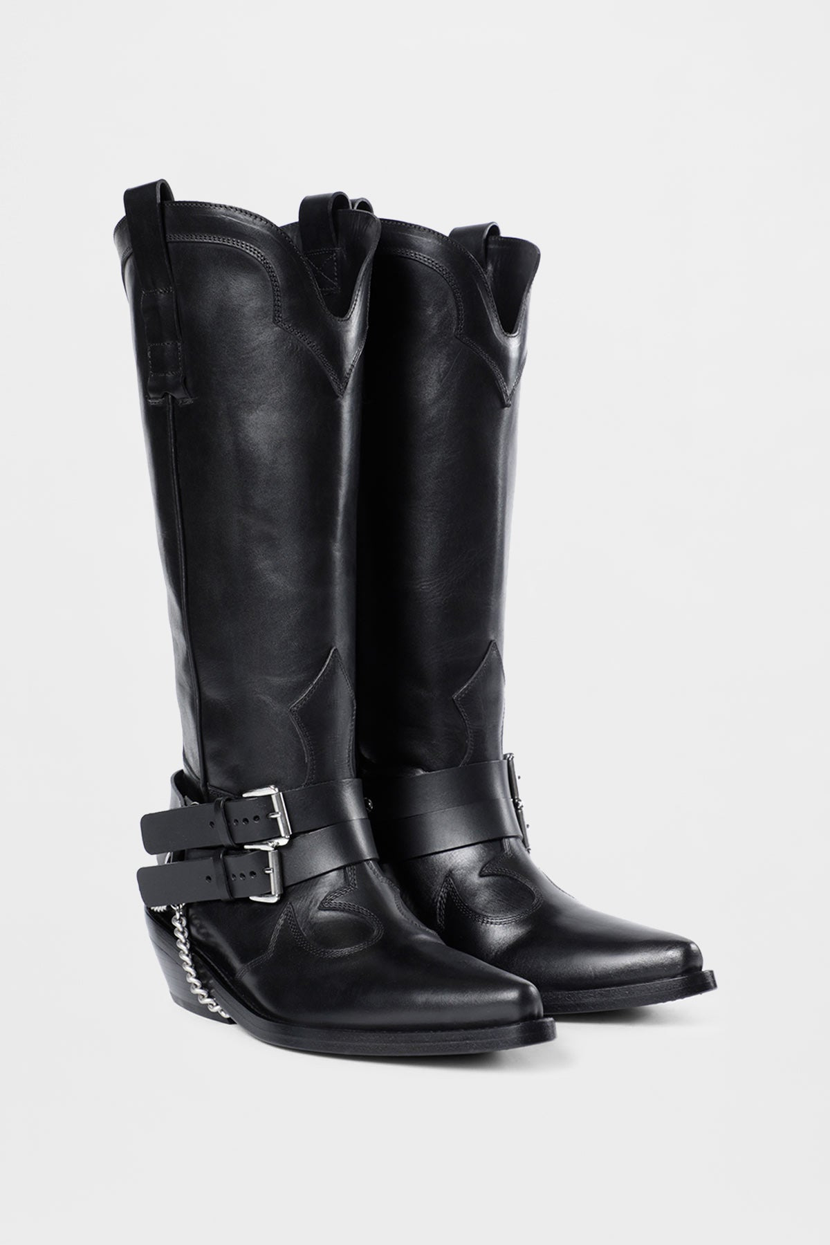 Finnbo Santiago Boots With Belts - Black - Cowhide Leather - Western-Inspired Silhouette - Multiple Buckled Straps - Under-Heel Metal Chain Detail - Pointed Toe - Side Zip Closure - Stacked Heel - Leather Sole - 100% Cow Leather - Made in Italy Ann Demeulemeester shoes embody the essence of luxury and comfort. The generously wide fit is a design choice aimed at ensuring a comfortable wear. For those who prefer a snugger fit, we recommend using an insole. Crafted from the highest quality leather, it is natural for the shoes to feel stiff initially. By wearing and walking in them, they will perfectly mold to the shape of your feet, offering unparalleled comfort. Care To maintain the beauty and integrity of your purchase, we recommend treating it with care. Simple maintenance practices, such as gentle washing and proper storage, can effectively preserve the longevity of your favorites. We encourage you to refer to the care instructions included with each item, designed to help you keep your purchase in top condition. Design Our dedication to excellence extends beyond materials; it encompasses the artistry and craftsmanship illustrated in every piece we create.