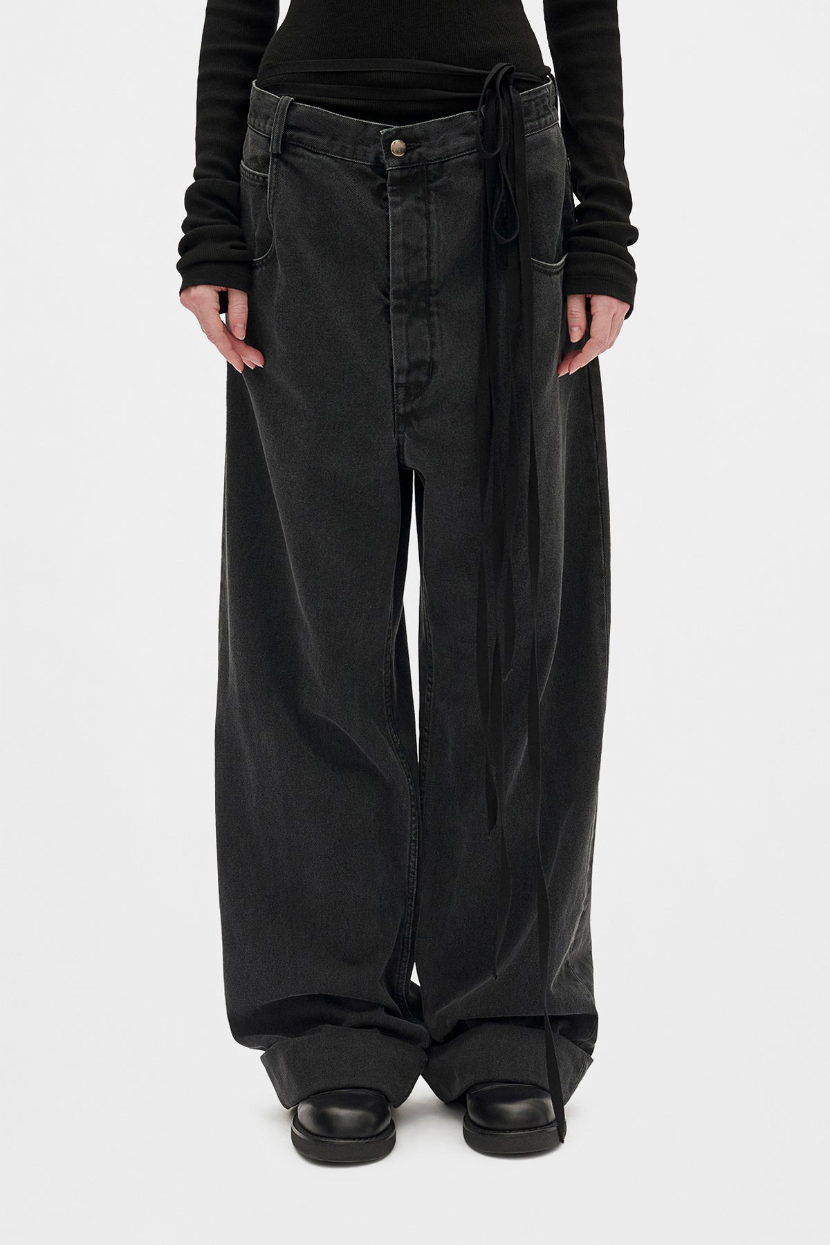 Women's denim grey Kristel five pockets high comfort trousers-Faded denim grey-Over Size Fit-Black laces closure detail-100% Cotton-Made in Italy Model wears Italian size 40 Height: 179 cm Waist: 58 cm Hips: 89 cm