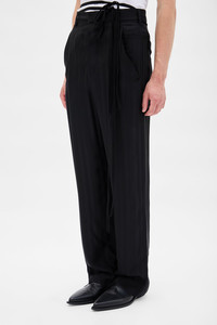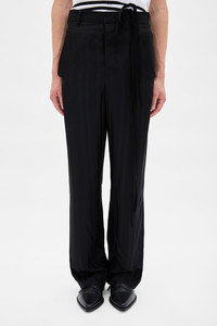 Leon Comfort Fit Trousers - Black - Striped Viscose - Belt Holes - Removable Signature Grosgrain Ribbon - Hook and Zip Closure - Side Pockets - Asymmetric Back Pockets - Straight fit -100% Viscose - Made in Italy The model wears italian size 46 The fit of this item is oversize. Consider this information when you select the size. Care To maintain the beauty and integrity of your purchase, we recommend treating it with care. Simple maintenance practices, such as gentle washing and proper storage, can effectively preserve the longevity of your favorites. We encourage you to refer to the care instructions included with each item, designed to help you keep your purchase in top condition. Design Our dedication to excellence extends beyond materials; it encompasses the artistry and craftsmanship illustrated in every piece we create.