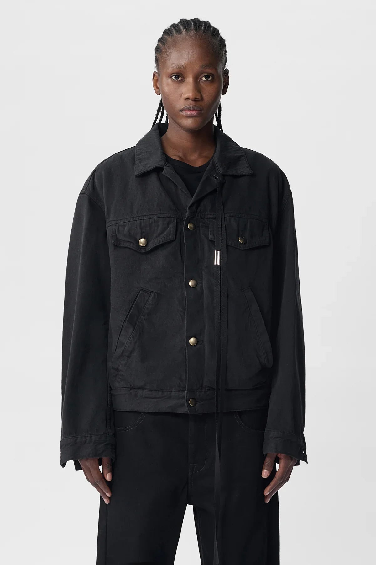 Women's black Marthe five pockets high comfort blouson-Denim Black-Buttons closure-Black ribbon detail-Chest pockets-100% Cotton-Made in Italy Model wears Italian size 40 Height: 181 cm Waist: 54 cm Hips: 89 cm