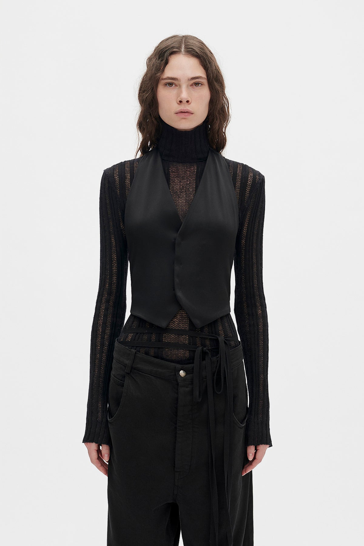 Mary Micro Waistcoat - Back - Cady Satin - V-Neck - Concealed Button Closure Sleeveless - Racer Back - Wrap-Around Signature Self-Tie Drawstring Waist - Cropped Hem - Fitted - 73% Acrylic, 27% Viscose - Made in Italy The model wears italian size 40 The fit of this item is narrow. Consider to purchase your usual size. Care To maintain the beauty and integrity of your purchase, we recommend treating it with care. Simple maintenance practices, such as gentle washing and proper storage, can effectively preserve the longevity of your favorites. We encourage you to refer to the care instructions included with each item, designed to help you keep your purchase in top condition. Design Our dedication to excellence extends beyond materials; it encompasses the artistry and craftsmanship illustrated in every piece we create.