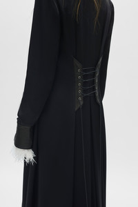 Melia X-Long Deconstructed Coat with Leather Contrast – Black – Laced On Back - Fluid Draped Silhouette – Shawl Collar with Leather Contrast Trim – Long Sleeves with Oversized Leather Cuffs – Floor-Length Hem with Flowing Train – Corset-Style Lace-Up Detail at the Back – Open Front Design – Lightweight Tailored Construction – 73% Acetate, 27% Viscose – Made in Italy Model wears italian size 40 The fit of this item is oversize. If you prefer a narrow fit, consider purchasing this item one size down from your usual size. Care To maintain the beauty and integrity of your purchase, we recommend treating it with care. Simple maintenance practices, such as gentle washing and proper storage, can effectively preserve the longevity of your favorites. We encourage you to refer to the care instructions included with each item, designed to help you keep your purchase in top condition. Design Our dedication to excellence extends beyond materials; it encompasses the artistry and craftsmanship illustrated in every piece we create.