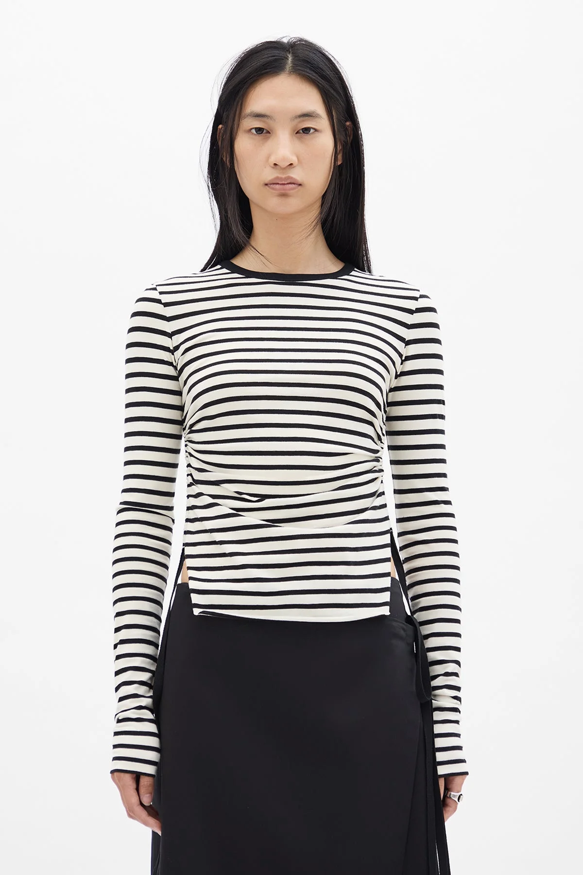 Oke Wrinkled Cropped Long Sleeve Top - Black/Chalk - 100% Cotton - Wrinkled Texture - Side Cut-Out Details - Crew Neck - Long Sleeves - Cropped Fit - Made in Portugal Model wears italian size S Care To maintain the beauty and integrity of your purchase, we recommend treating it with care. Simple maintenance practices, such as gentle washing and proper storage, can effectively preserve the longevity of your favorites. We encourage you to refer to the care instructions included with each item, designed to help you keep your purchase in top condition. Design Our dedication to excellence extends beyond materials; it encompasses the artistry and craftsmanship illustrated in every piece we create.