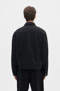 Men's Patrick five pockets jacket- Black Denim- Over Size Fit- Black ribbon detail- button closure- 100% Cotton- Made in Italy Model wears Italian size 48 Height: 188 cm Waist: 73 cm Hips: 86 cm