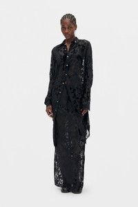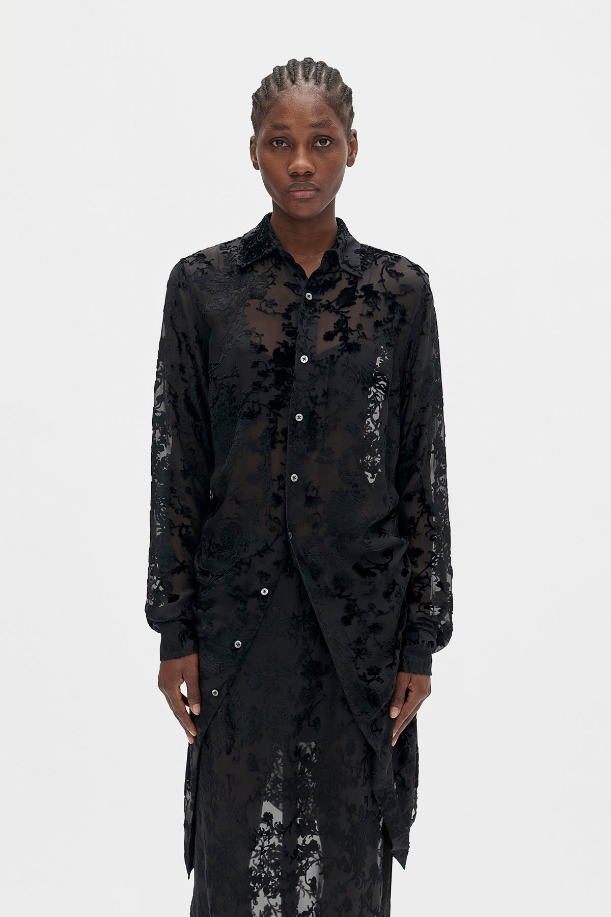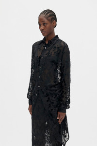 Rada High Comfort Devore Shirt - black - Velvet Devore - Classic Collar - Button Closure - Adjustable Drawstring Waist - Dropped Shoulders - Long Sleeves - Buttoned Cuffs - Elongated Hem - Relaxed Fit - 80% Viscose, 20% Silk - Made in Italy Model wears italian size 40 The fit of this item is oversize. If you prefer a narrow fit, consider purchasing this item two size down from your usual size Care To maintain the beauty and integrity of your purchase, we recommend treating it with care. Simple maintenance practices, such as gentle washing and proper storage, can effectively preserve the longevity of your favorites. We encourage you to refer to the care instructions included with each item, designed to help you keep your purchase in top condition. Design Our dedication to excellence extends beyond materials; it encompasses the artistry and craftsmanship illustrated in every piece we create.