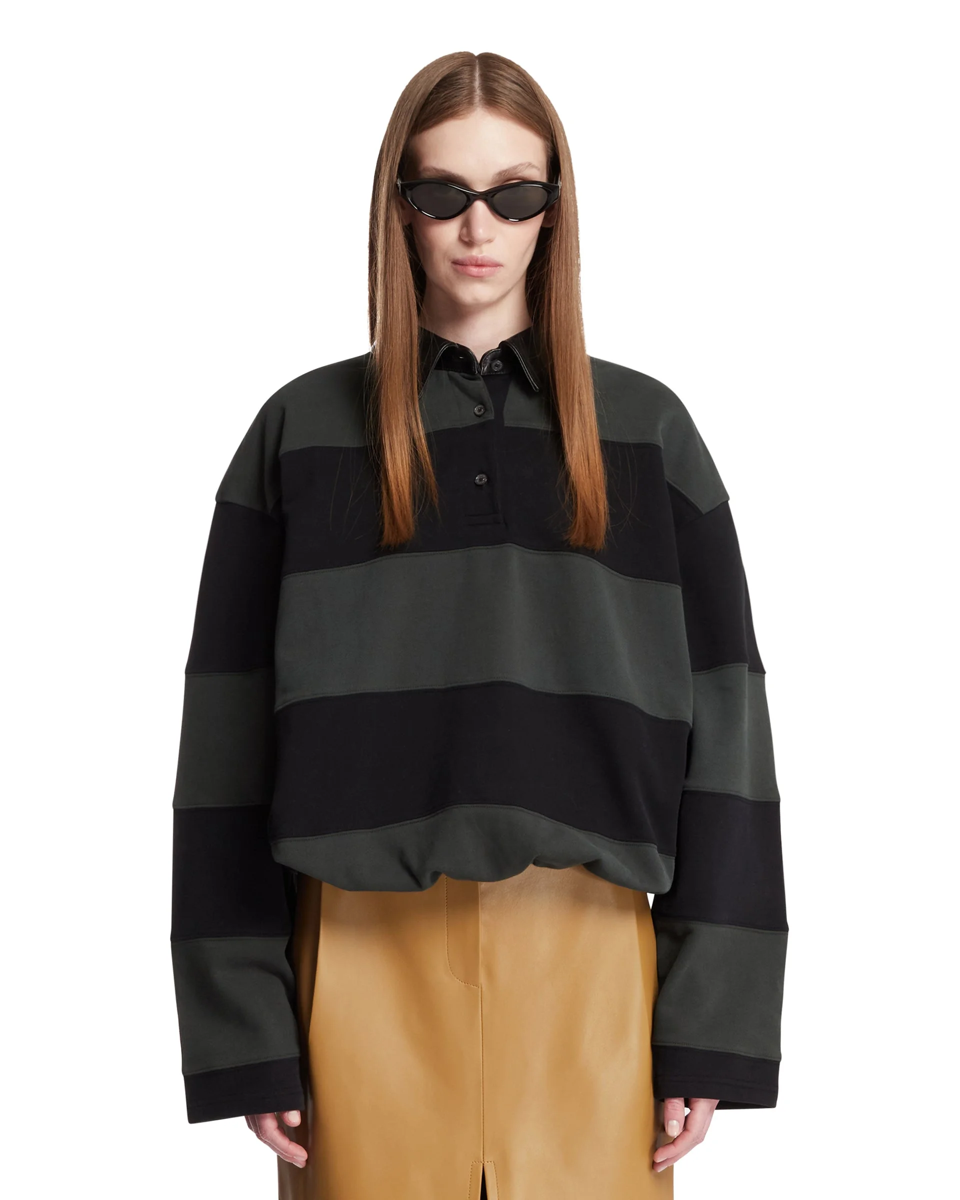 Acne Studios Green Polo-Collar Sweatshirt. Green striped cotton, leather polo collar with three buttons, long sleeves, leather logo label on the back, gathered hem. Yana is 178 cm and she is wearing size S. DETAILS Model: AI0183BGE Composition: 100% Cotton; Detail: 100% Leather Made in: PORTUGAL Season: SS26
