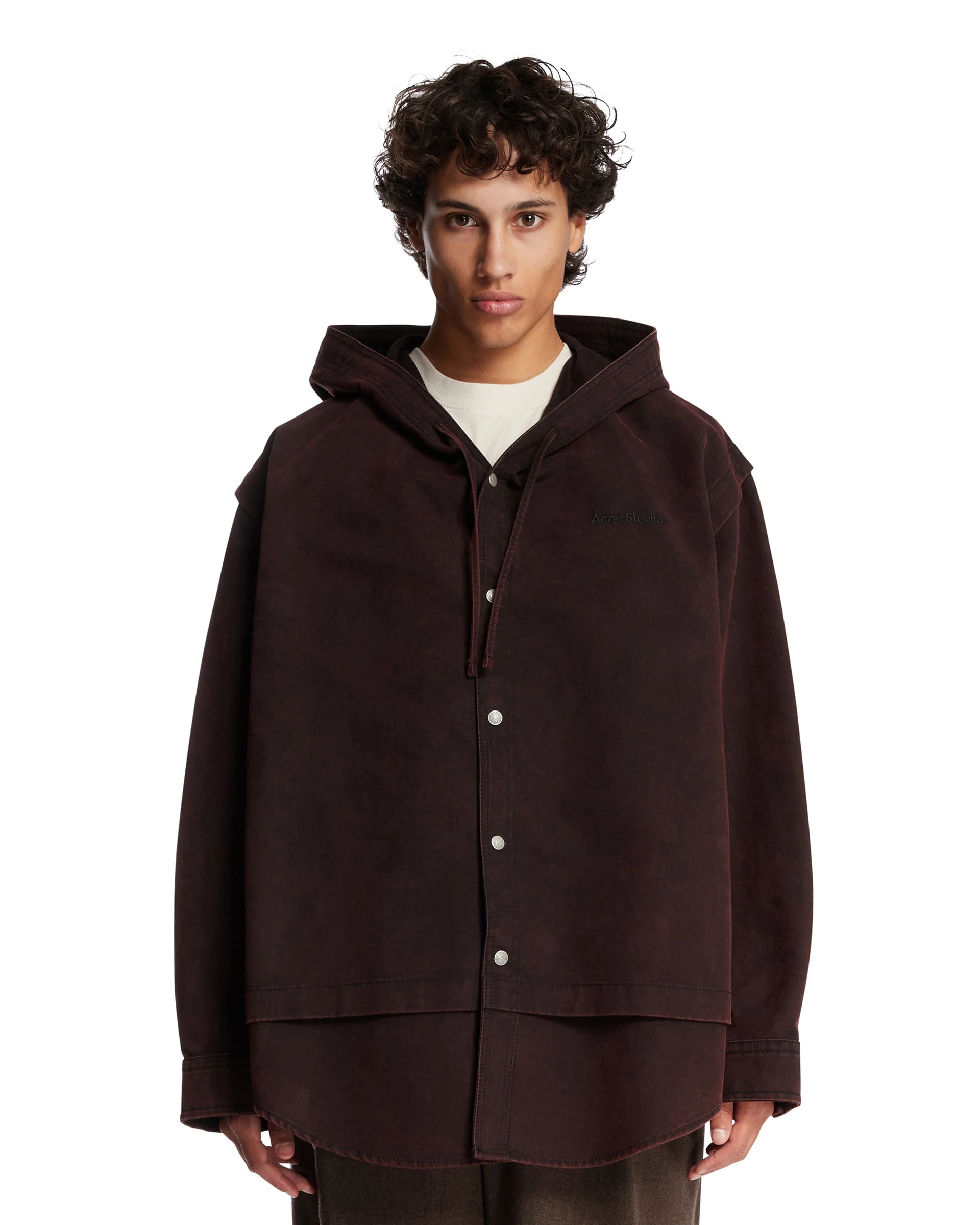 Acne Studios Purple Layered Hooded Jacket. Purple cotton satin, long sleeves, hood with external drawstring, layered construction. Snap button closure, side seam pockets, embroidered logo, relaxed fit. Yassine is 185 cm and he is wearing size 50. DETAILS Model: B90860479 Composition: 100% Cotton Made in: ROMANIA Season: FW25-26