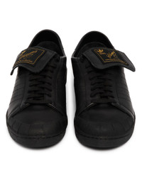 Adidas Originals x Willy Chavarria Black Jabbar Low Sneakers. Black leather upper, iconic contrasting side stripes, classic lacing, folded tongue with a logo label, rubber sole, rounded toe, regular fit. DETAILS Model: HQ4867BLACK Composition: Upper: 100% Leather; Sole: 100% Rubber Made in: Indonesia Season: FW25-26