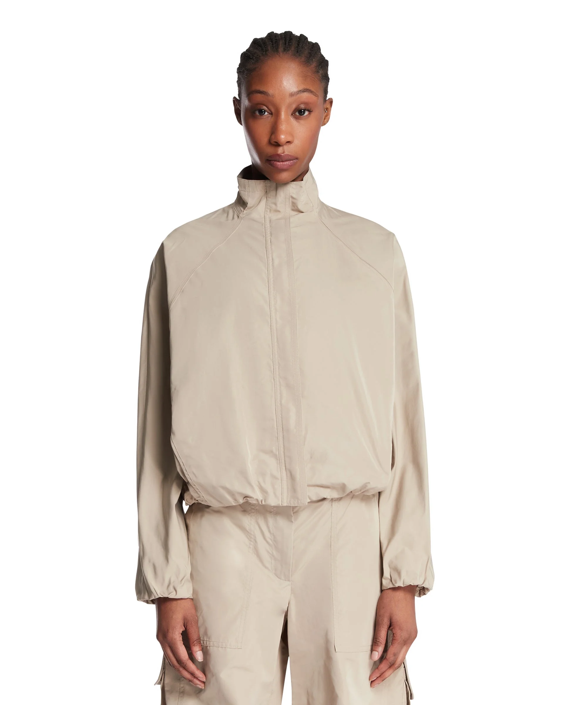 Alaia Beige Radzimir Windbreaker. Beige radzimir, high radzimir collar, relaxed silhouette, raglan sleeves, front zip closure. Zip with gold-tone metal details and elasticated straight hem, regular fit. Vania is 179 cm and she is wearing size 36. DETAILS Model: AA9V1231W128C124 Composition: 70% Polyester, 30% Silk Made in: ITALY Season: SS26