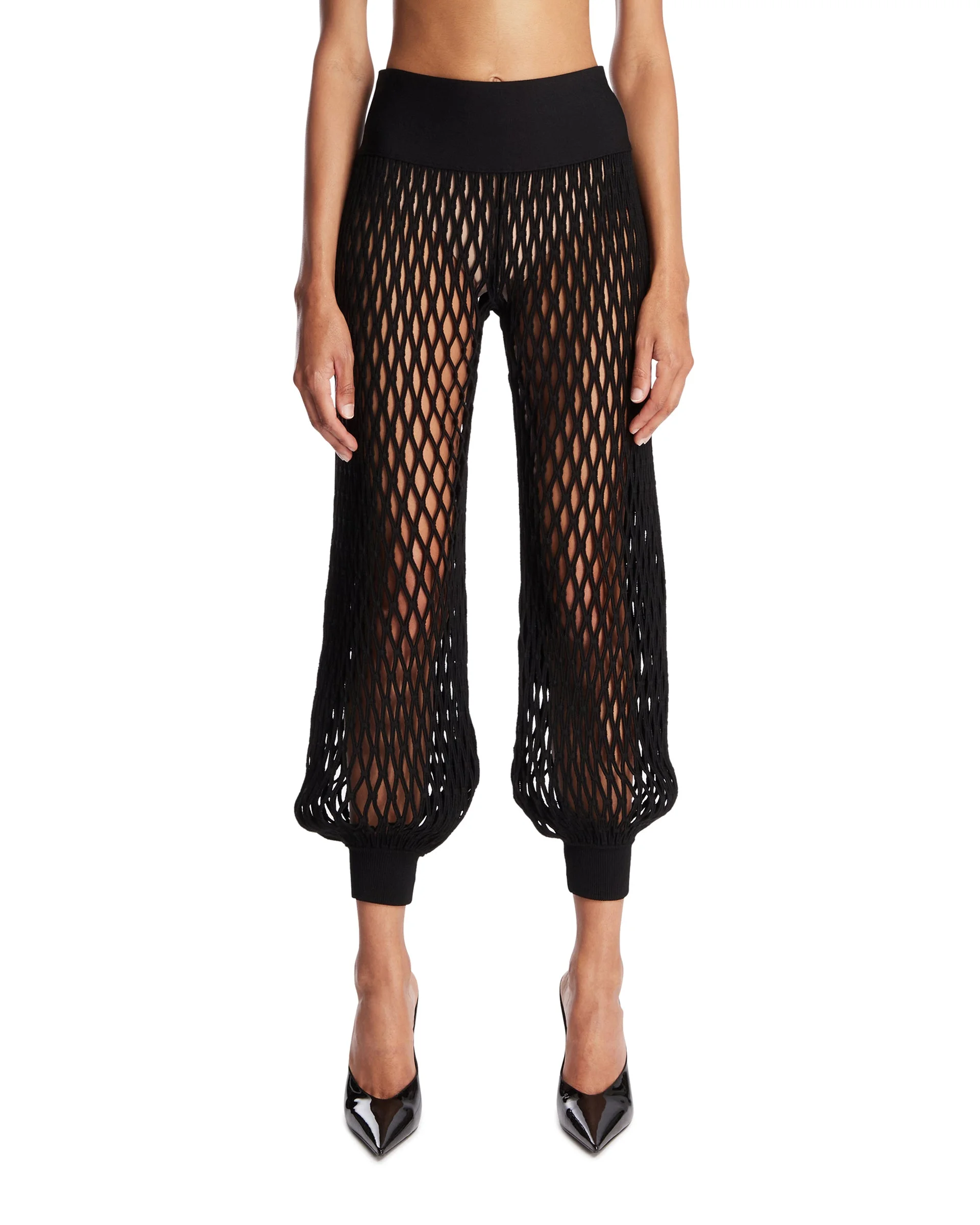 Alaia Black Balloon Mesh Pants. Black stretch viscose open-knit fabric, low-rise waist, ribbed elasticated cuffs. Balloon silhouette, wide leg, regular fit. Aline is 180 cm and she is wearing size36. DETAILS Model: AA9P1146K003A995 Composition: 65% Viscose, 25% Polyester, 6% Linen, 3% Polyamide, 1% Elastane Made in: ITALY Season: FW25-26