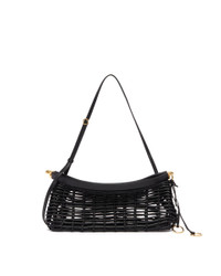 Alaia Black East West Media Woven Bag. Black leather, woven design, curved shape, zip closure with leather trim. Iconic folded detail at the base, decorative laces with metal rings. Folded bottom, gold-tone hardware. Size (cm): 32X15X7 DETAILS Model: AA1S01430CA576999 Composition: 100% Leather; Detail: 100% Brass Made in: ITALY Season: FW25-26