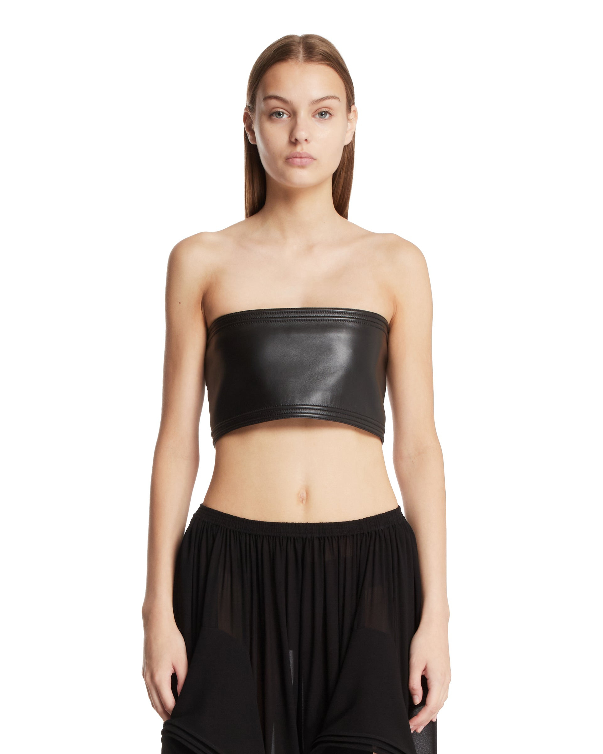 Alaia Black Leather Bustier. Black leather, tone-on-tone piping details at the edges, back zip closure, cropped cut. Perla is 176 cm and she is wearing size 36. DETAILS Model: AA9H1272C228B995 Composition: 100% Leather; Lining: 100% Cupro Made in: ITALY Season: FW25-26