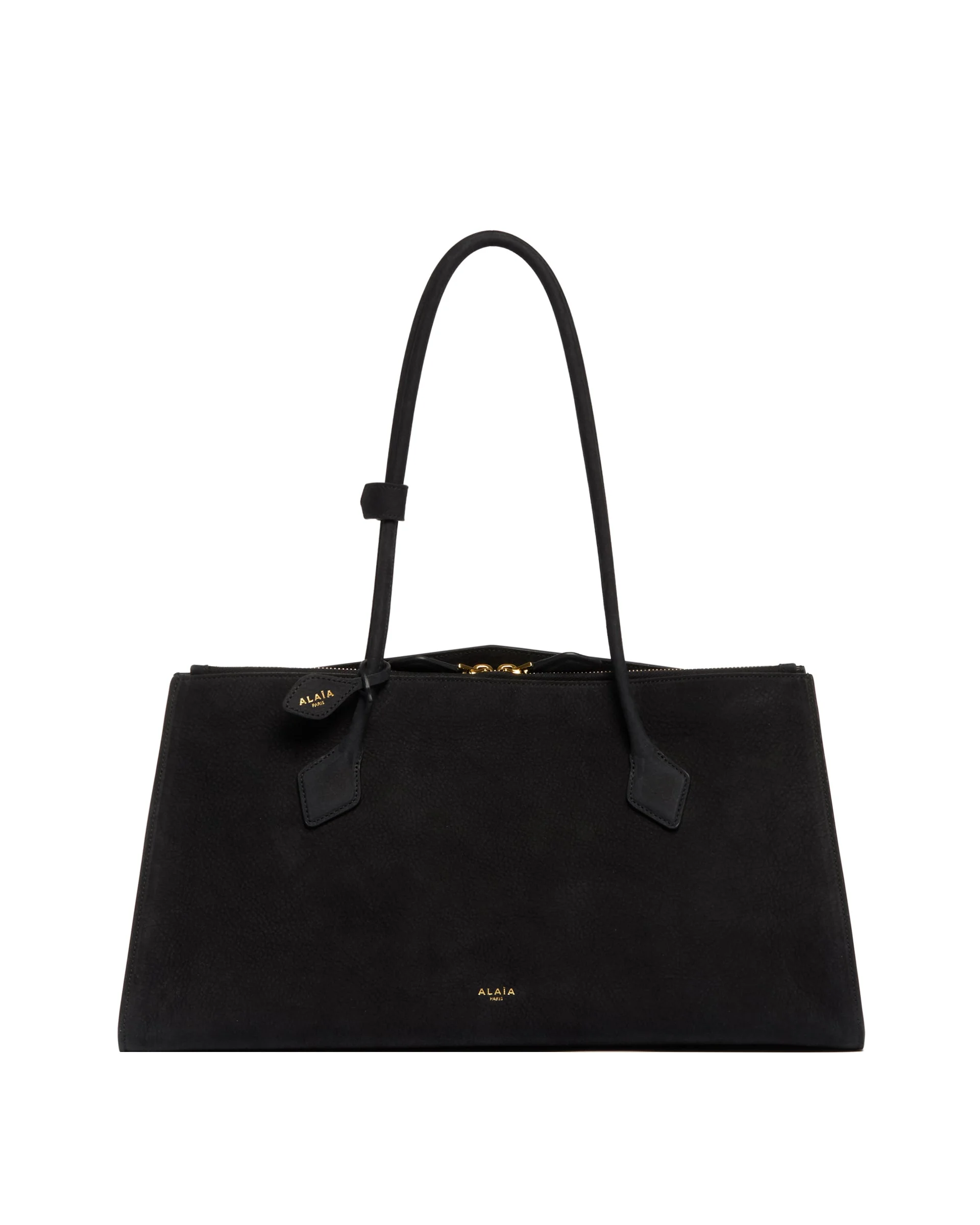 Alaia Black Leather Le Teckel Tote Bag. Black leather, long tone-on-tone tubular handles with decorative laces, two wide gussets with a magnetic closure and a front pocket with double zip closure. Gold-tone hardware and leather lining. Size (cm): 41X21X18 DETAILS Model: AA1S06043CA214956 Composition: 100% Leather; Details: 100% Brass Made in: ITALY Season: SS25