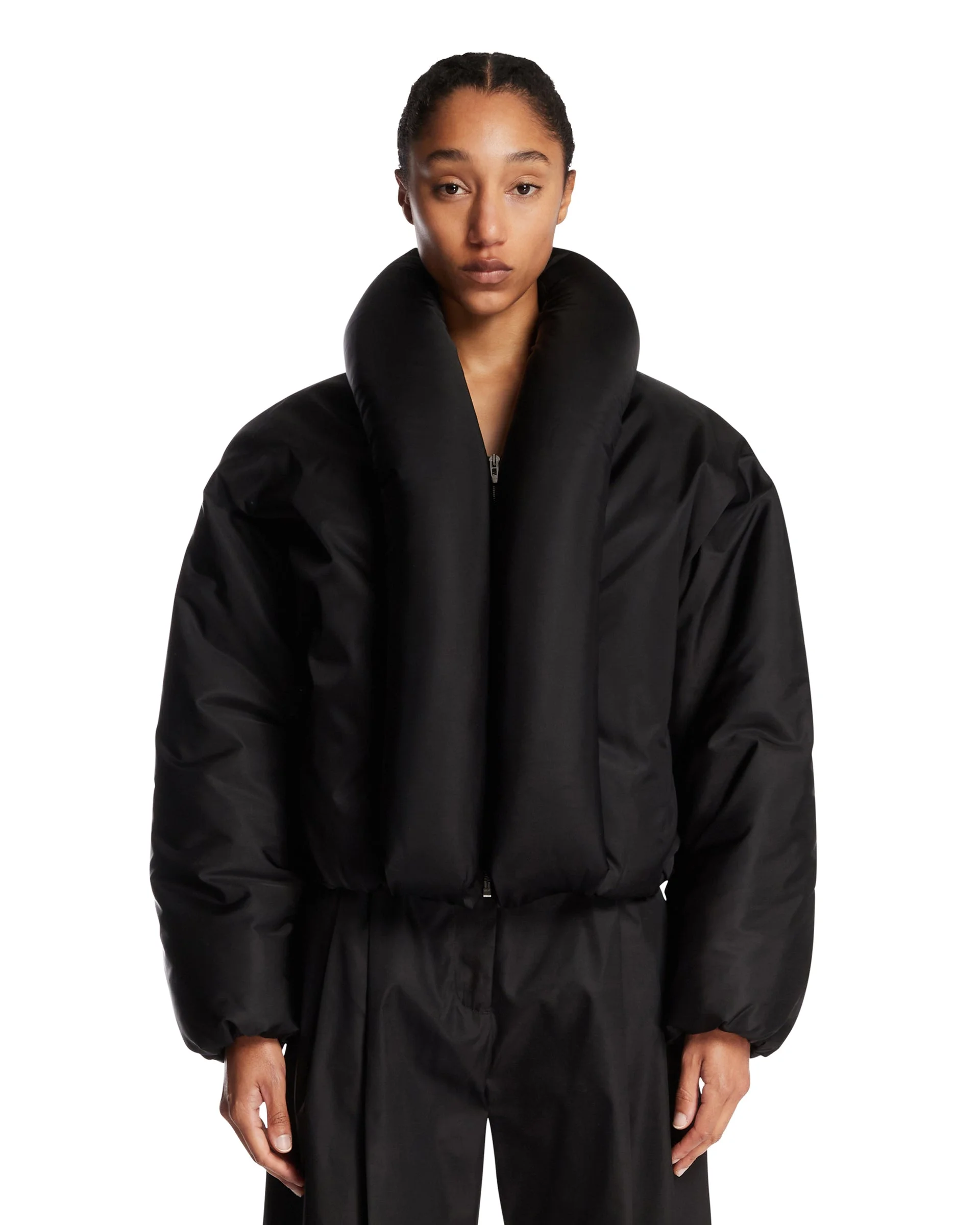 Alaia Black Padded Taffeta Bomber. Black technical fabric, polyester padding, long sleeves, padded tubular lapels, gathered waist and cuffs. Rounded shape, side pockets, lined. Aline is 180 cm and she is wearing size 36. DETAILS Model: AA9V1163T448B995 Composition: 96% Polyamide, 4% Polyurethane; Lining: 100% Polyester; Padding: 100% Polyester Made in: ITALY Season: FW25-26