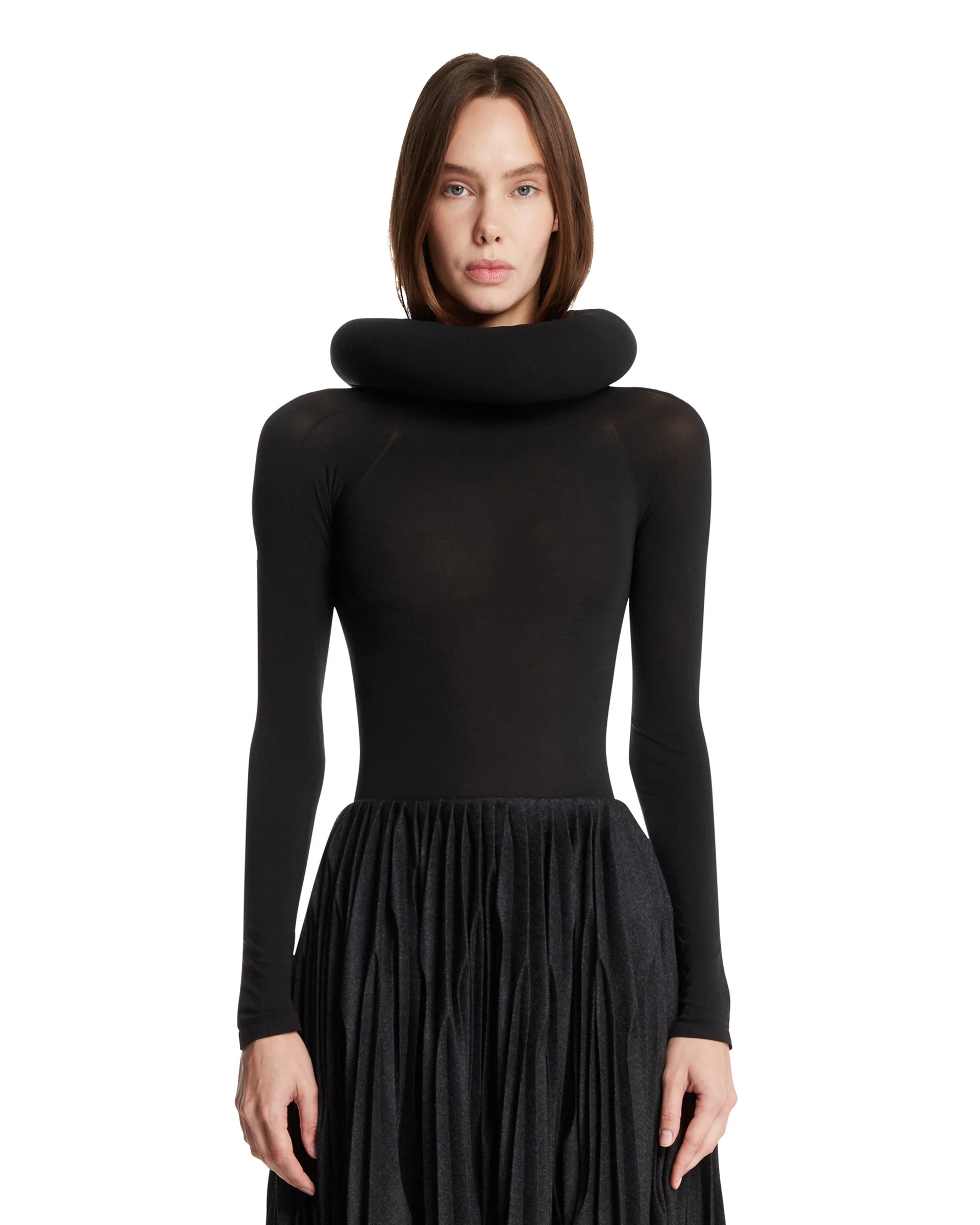 Alaia Black Sculptural Hooded Bodysuit. Black second-skin effect knit, long sleeves, tone-on-tone sculptural circular hood. Fitted silhouette. Daniele is 178 cm and she is wearing size 36. DETAILS Model: AA9B0409M826B995 Composition: 76% Polyamide, 25% Elastane; Padding: 100% Polyester Made in: ITALY Season: FW25-26