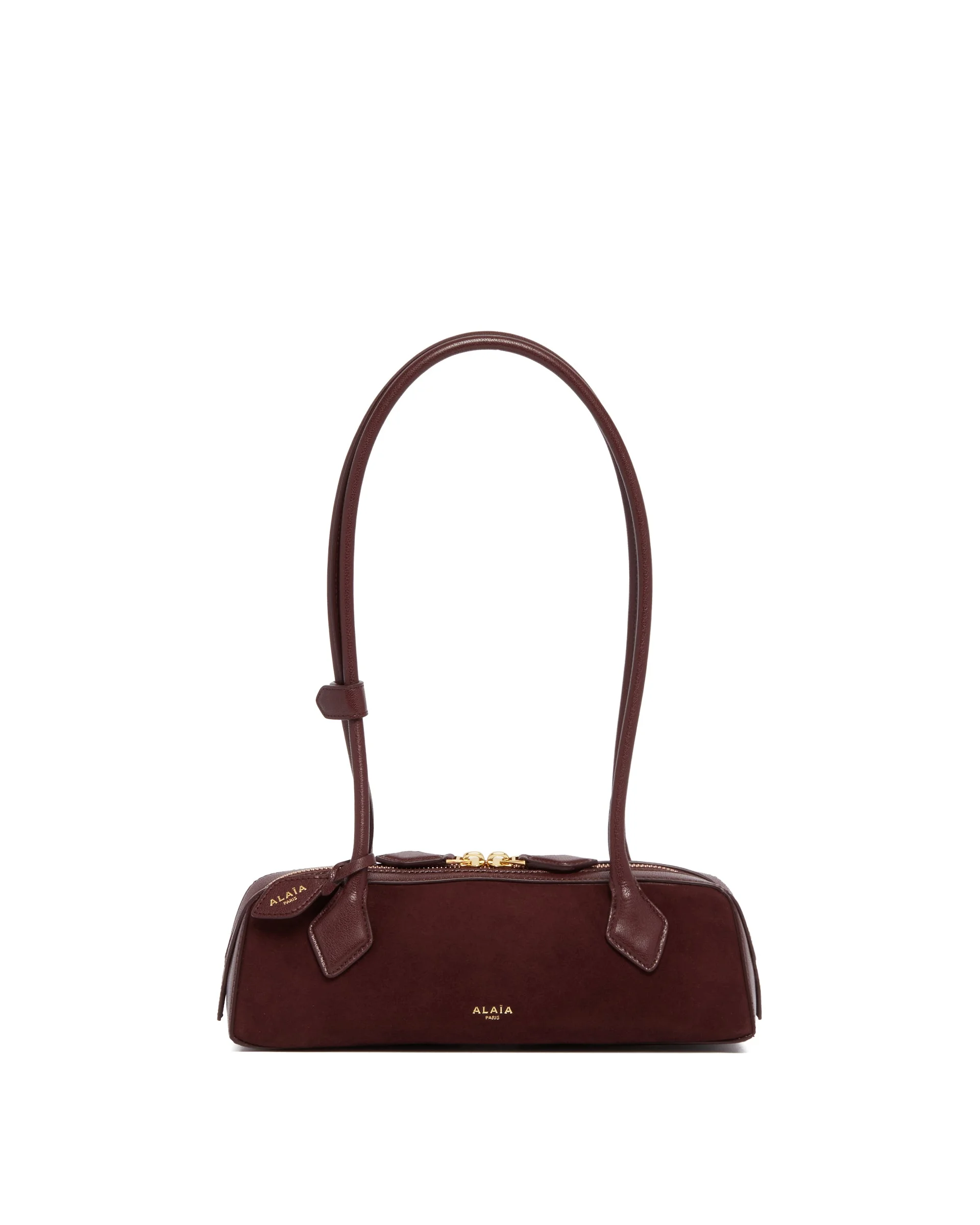 Alaia Burgundy Small Le Teckel Bag. Burgundy suede, elongated shape, tone-on-tone leather tubular handles, two decorative leather straps. Double zip closure, removable mirror in the internal pocket. Fully lined, logo detail, gold-tone hardware. Size (cm): 26X8X8 DETAILS Model: AA1S06029CA577325 Composition: 100% Leather; Details: 100& Brass Made in: ITALY Season: FW25-26