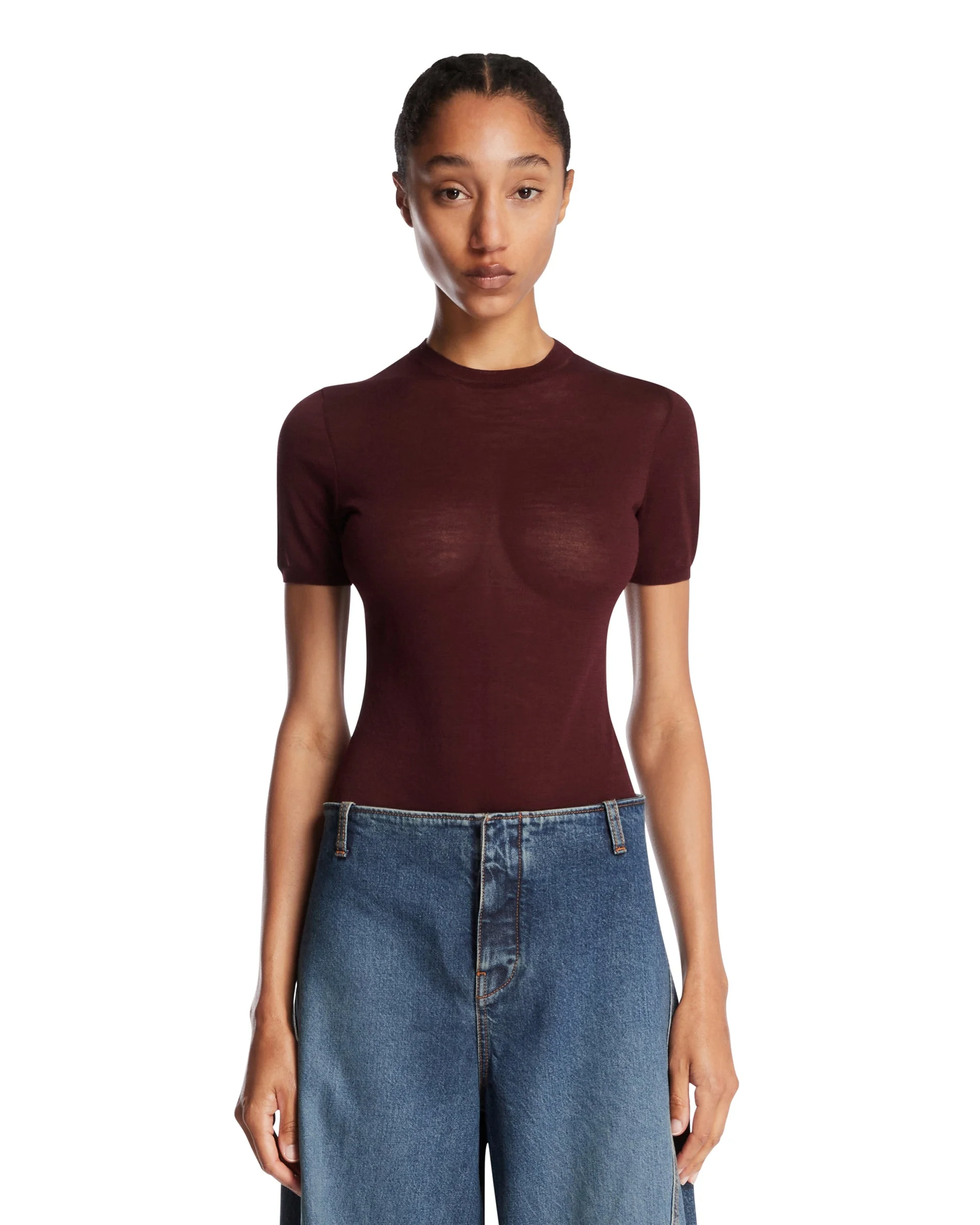 Alaia Burgundy Wool and Silk Bodysuit. Burgundy wool blend and silk, semi-sheer finish, short sleeves, crew neck, classic brief with bottom closure. Slim fit. Aline is 180 cm and she is wearing size 36. DETAILS Model: AA9B0403K097B413 Composition: 56% Wool, 41% Silk, 3% Polyamide Made in: ITALY Season: FW25-26