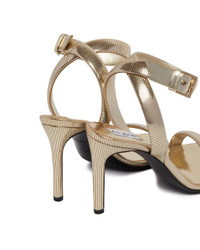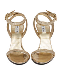 Alaia Gold Leather Chain Sandals. Upper in fine laser-engraved calfskin leather to create a gold chain effect, adjustable ankle strap, covered heel and insole. Open-toe design, leather sole. Heel Height: 9 cm DETAILS Model: AA3S135CK321240 Composition: 100% Leather Made in: ITALY Season: FW25-26