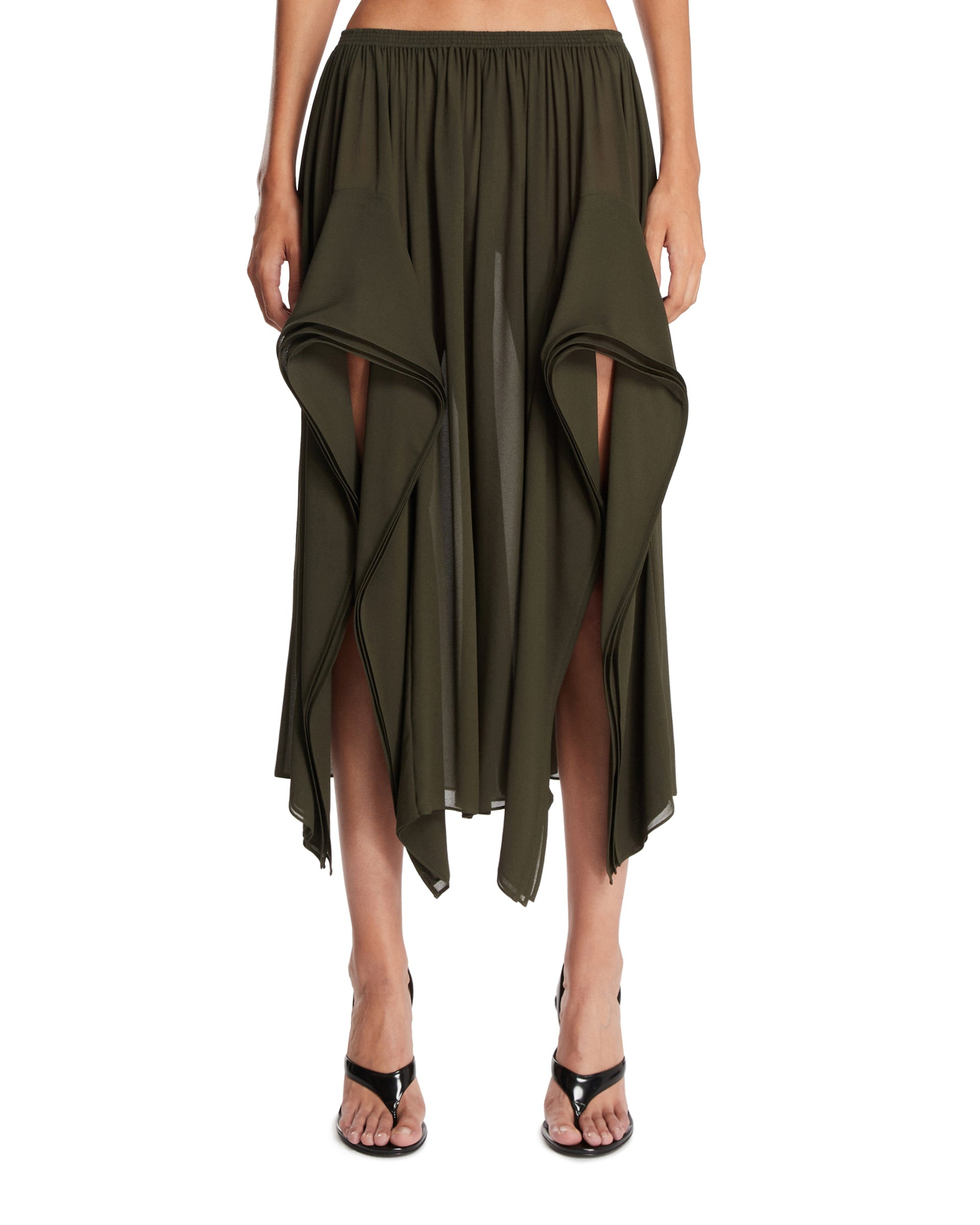 Alaia Green Pants with Ruffles. Green viscose fabric, elasticated waistband, ruffled slits at the front, two side pockets, asymmetric hem. Anna is 178 cm and she is wearing size 36. DETAILS Model: AA9P1189T666B643 Composition: 100% Viscose Made in: FRANCE Season: FW25-26