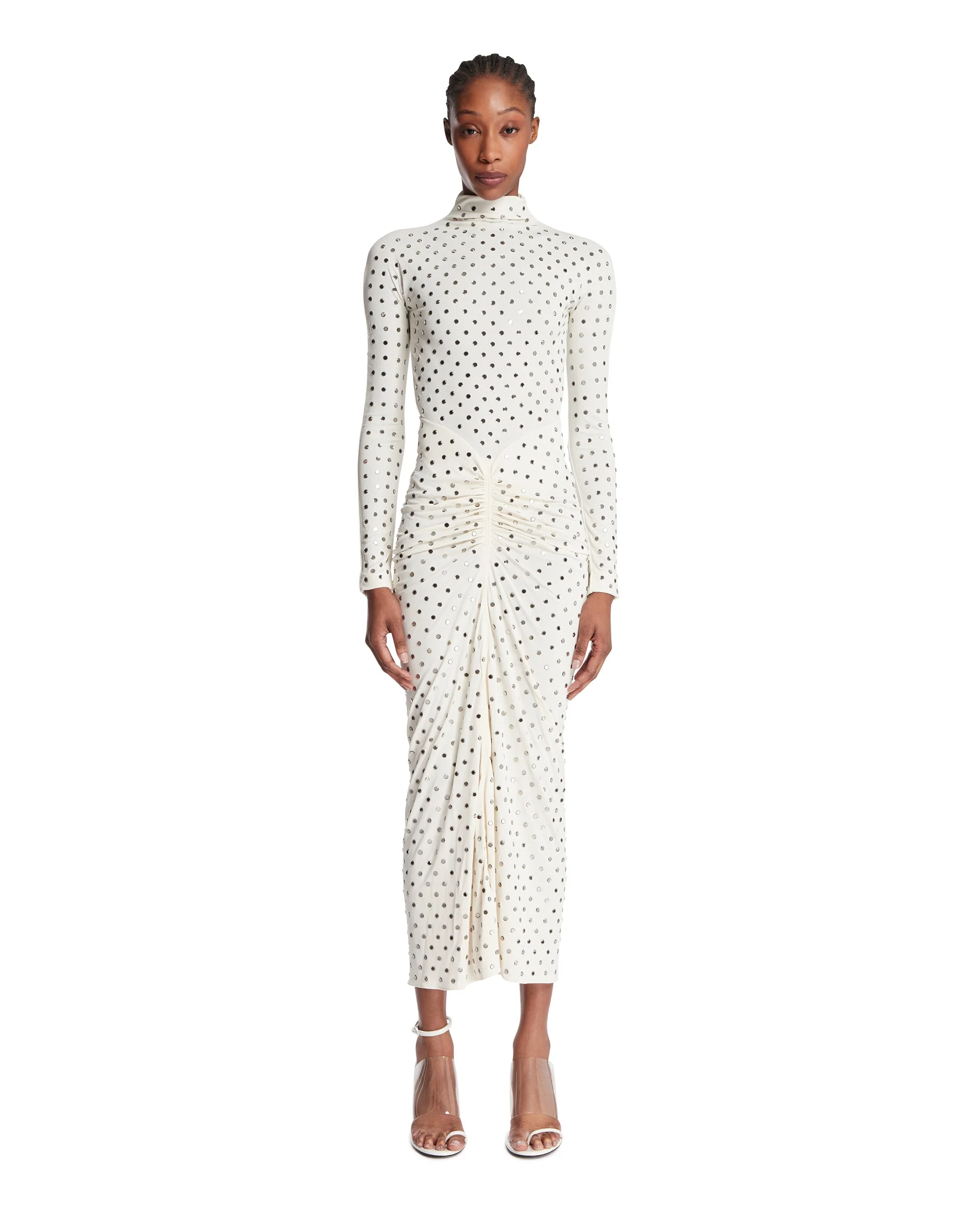 Alaia White Draped Jersey Dress with Rhinestones. Fluid white jersey with all-over rhinestones, draped design, maxi length, high neckline, long sleeves, column silhouette. Body-conscious fit cinched at the waist, invisible side zip closure, unlined. Vania is 179 cm and she is wearing size 36. DETAILS Model: AA9R2916X096CA26 Composition: 100% Viscose; Details: 100% Glass Made in: ITALY Season: SS26